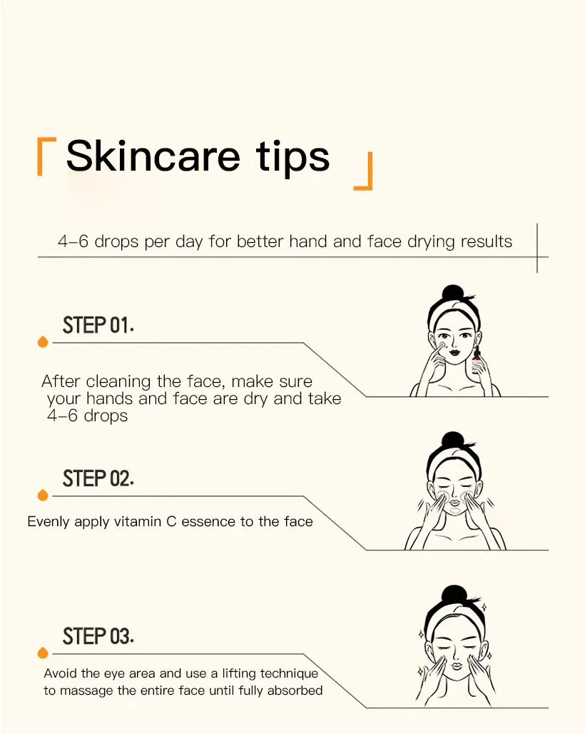 For best results, apply a few drops of the Vitamin C Facial Care Solution to cleansed skin in the morning and evening. Gently massage into the face and neck, allowing it to absorb fully before applying moisturizer and sunscreen.