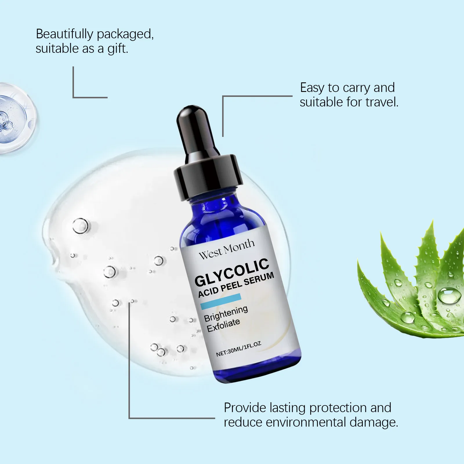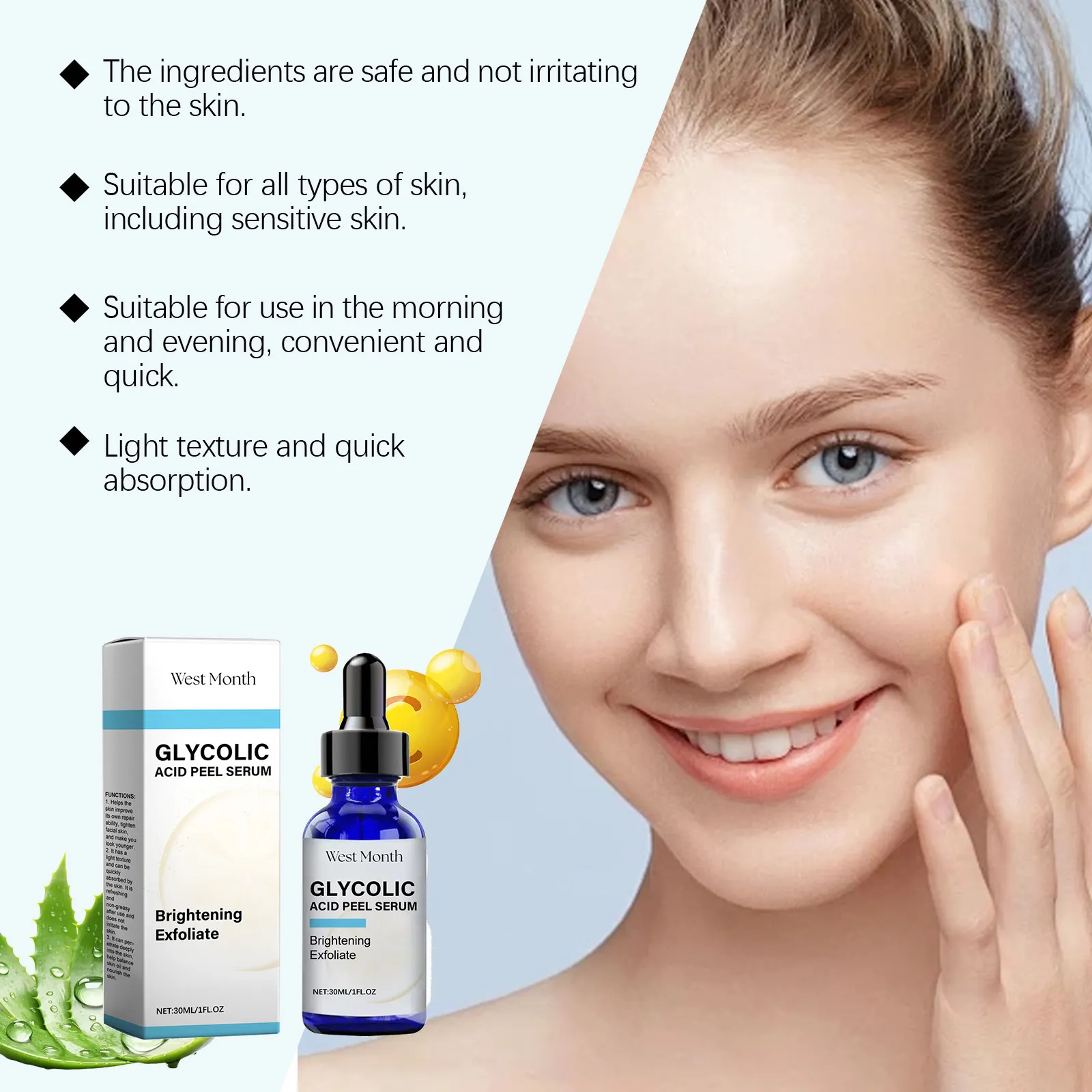 Ingredients: Water, ascorbic acid (vitamin C), aloe vera leaf extract, hyaluronic acid, glycolic acid