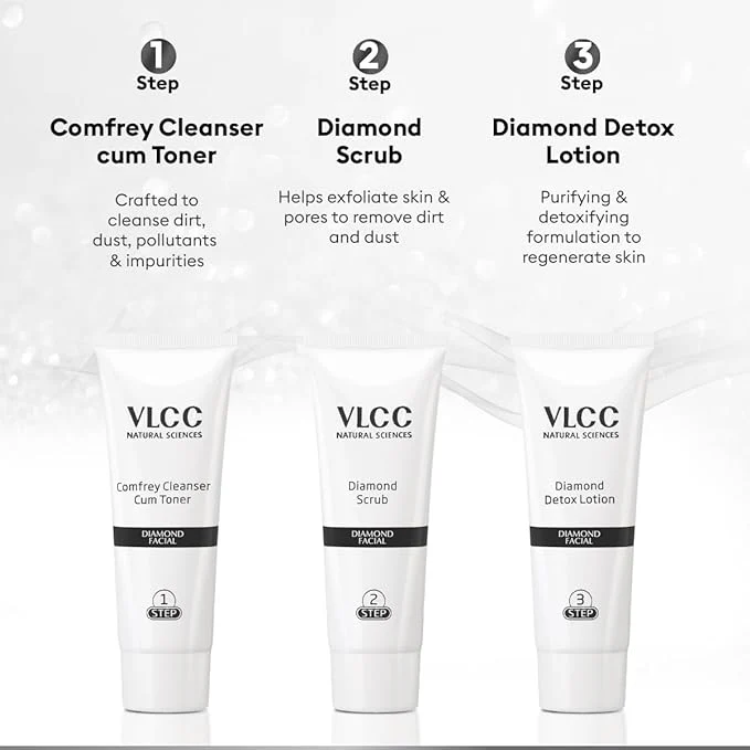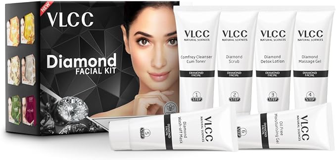 The VLCC Diamond Facial Kit includes all the essential steps needed for a complete facial experience: