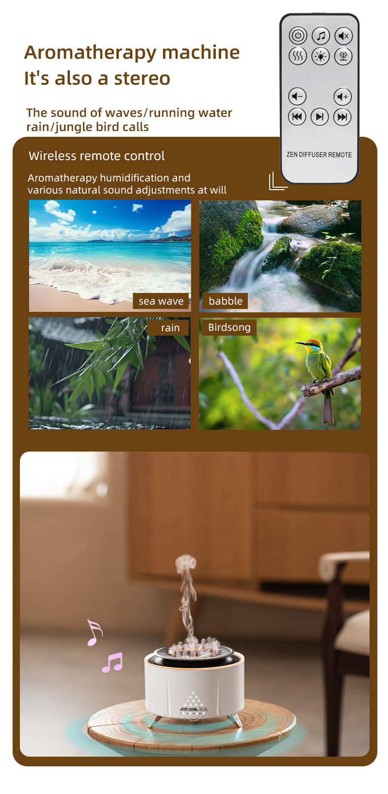 The remote control feature offers convenience and ease of use, allowing customers to adjust the settings without leaving their seat. Whether it's for relaxing at home, adding ambiance to a living room, or creating a unique atmosphere in an office, this diffuser is both a decorative piece and a functional appliance.