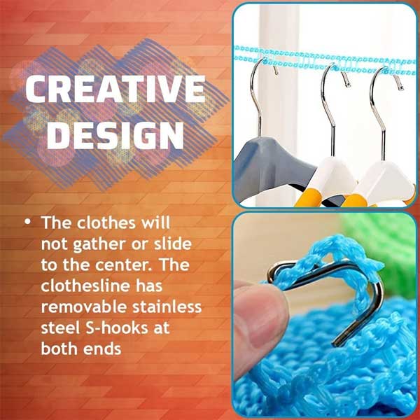 - You candry multiple clothes at the same time, the clothes will not gather or slide to the center. The clothesline has removable stainless steel S-hooks at both ends that hold the clothesline anywhere and adjust the length to suit your needs.