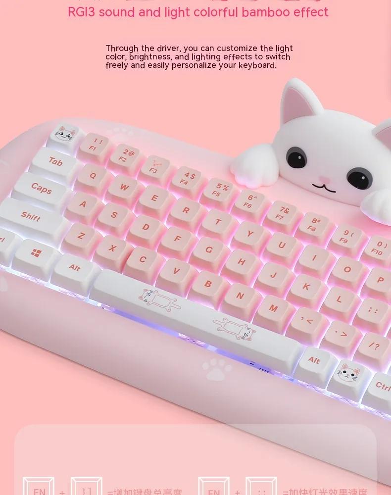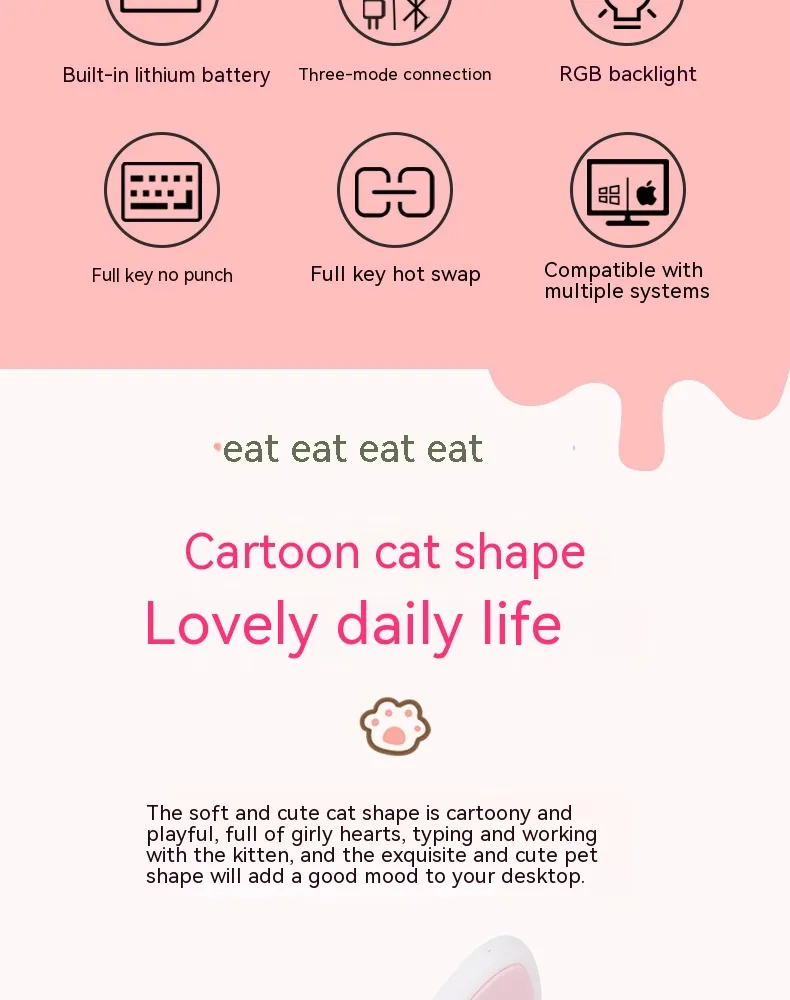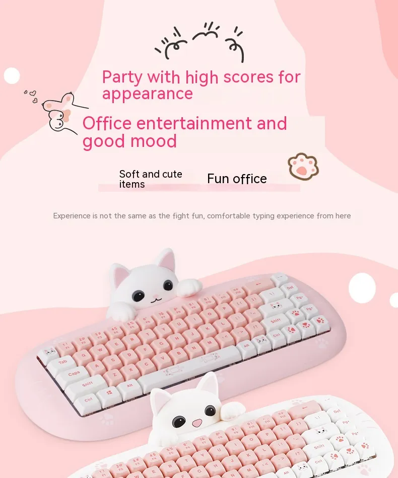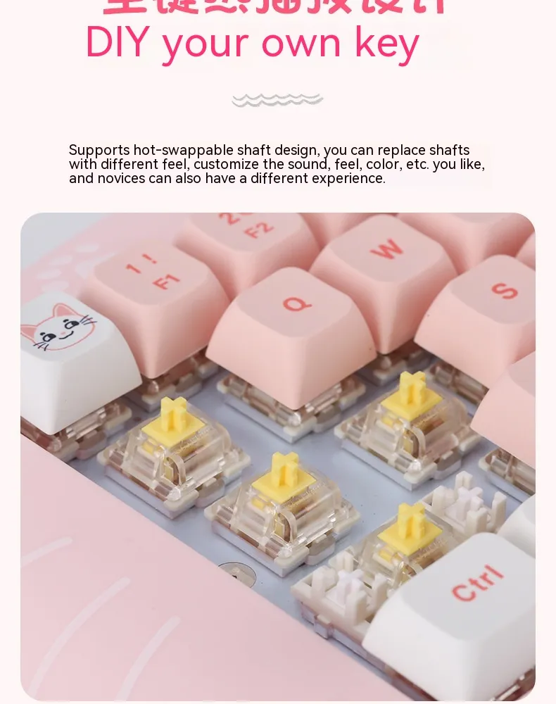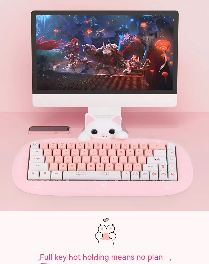 With its cute, aesthetic design, this mini mechanical keyboard adds a fun touch to any workspace or gaming station. It features customizable keycaps, allowing you to personalize the look to match your style. The battery life supports long hours of use without frequent recharging, making it reliable for both gaming marathons and extended workdays. Whether you're typing away in an office or battling in an e-sports tournament, this keyboard provides a mix of functionality, style, and convenience, perfect for users who demand performance with a touch of flair.