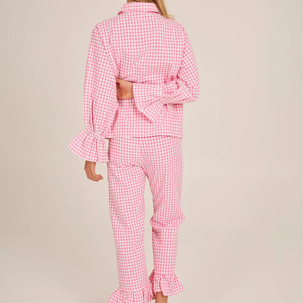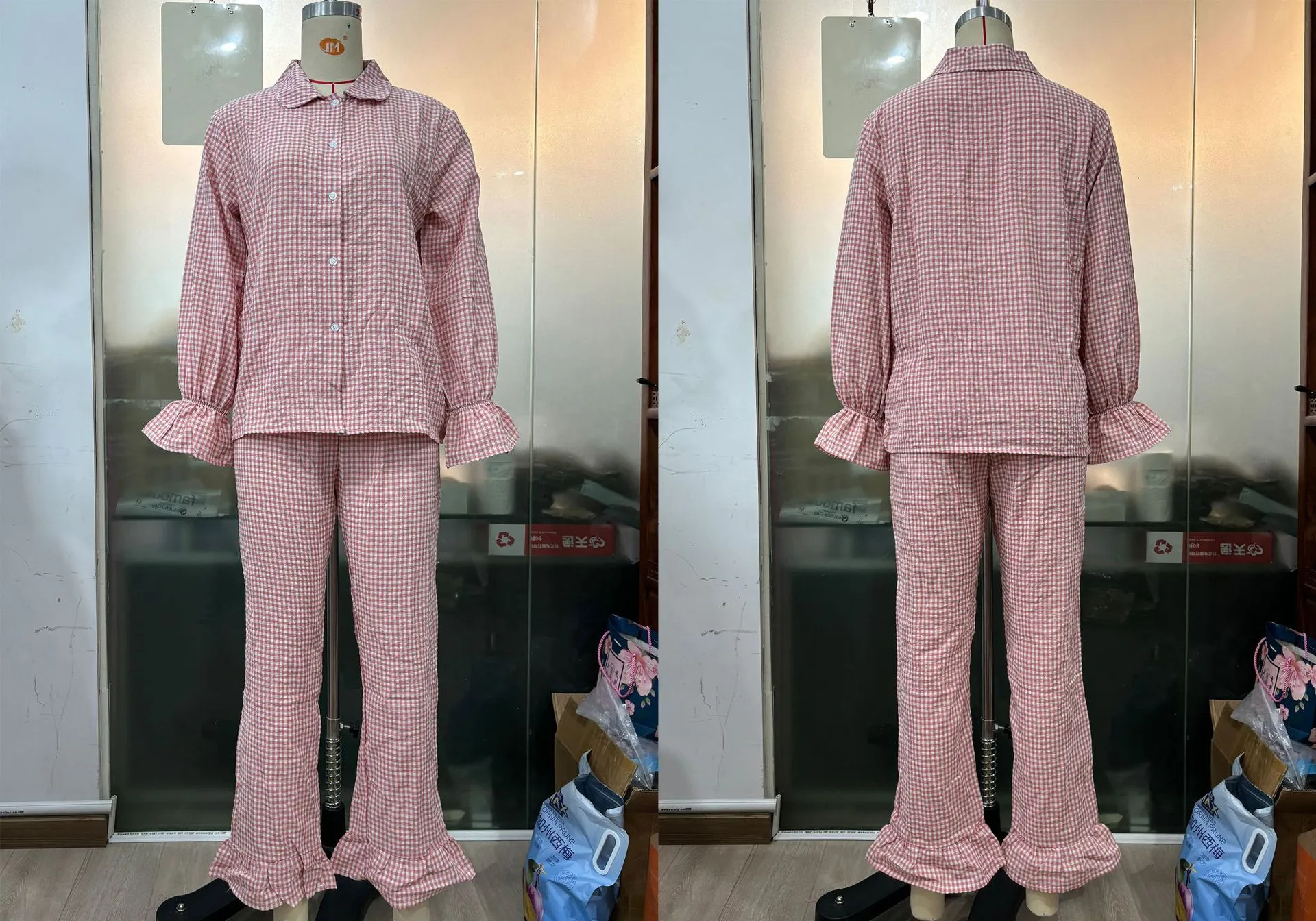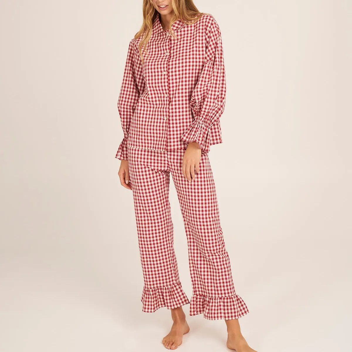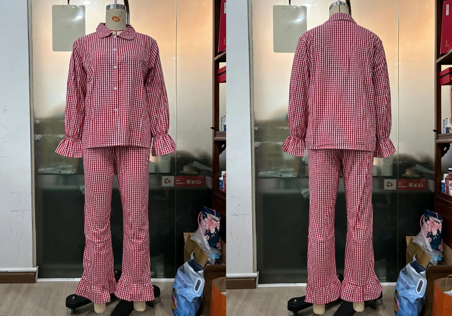 - Feature: Plaid pattern, gingham lounge outfits, Y2k plaid pajama set, puff peplum shirt ruffle pants lounge set, tie front puff sleeve babydoll top, matching with ruffle hem wide leg pants, cute ruffle trim pj set, gingham pants pjs.