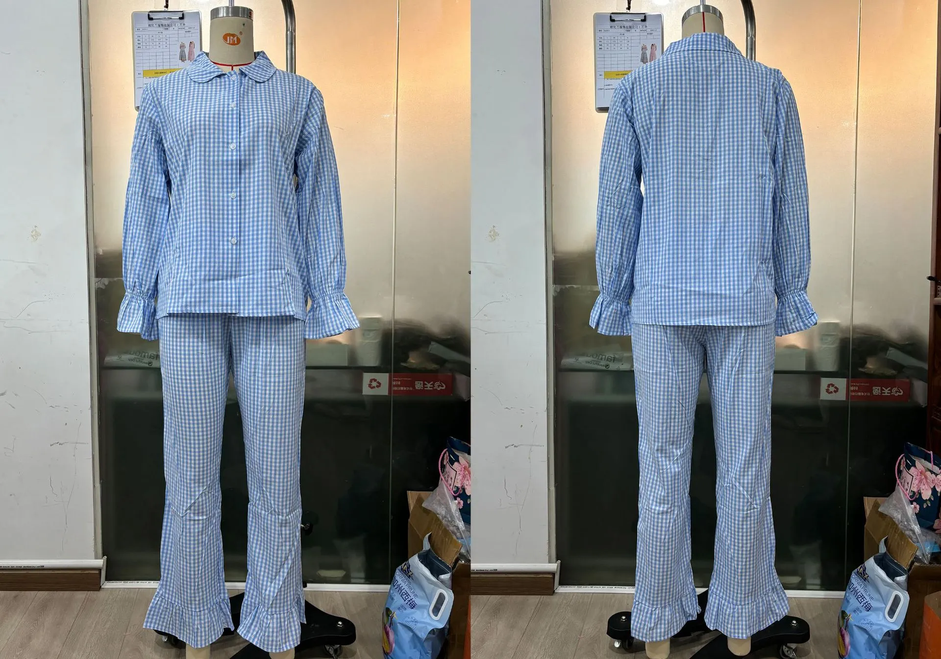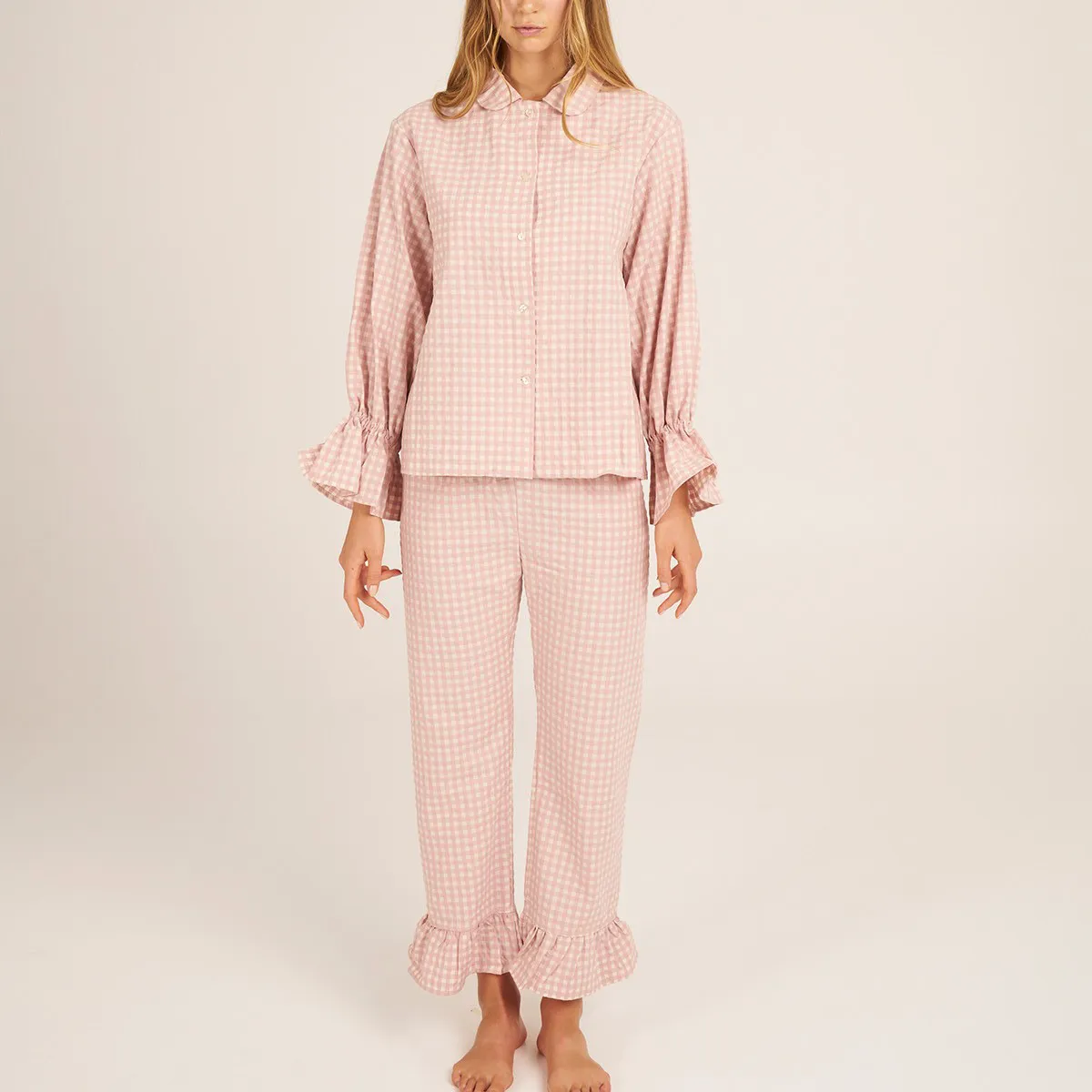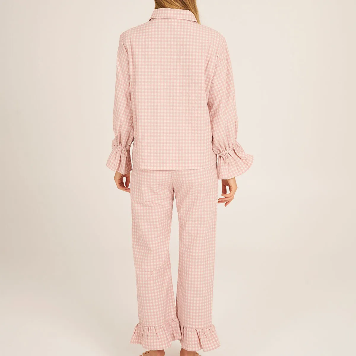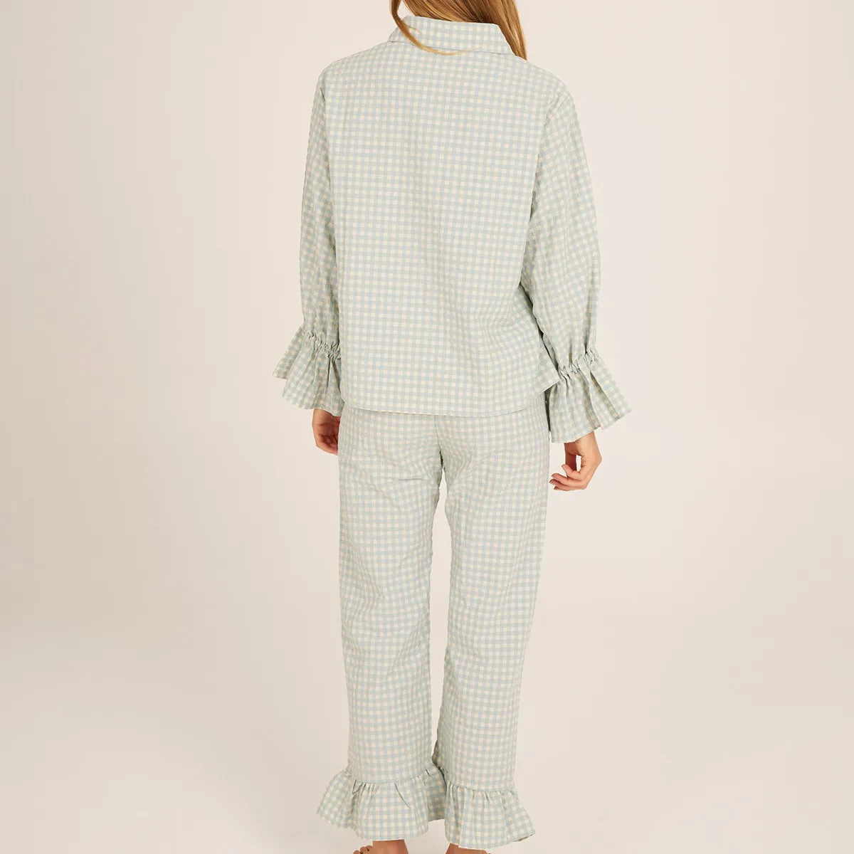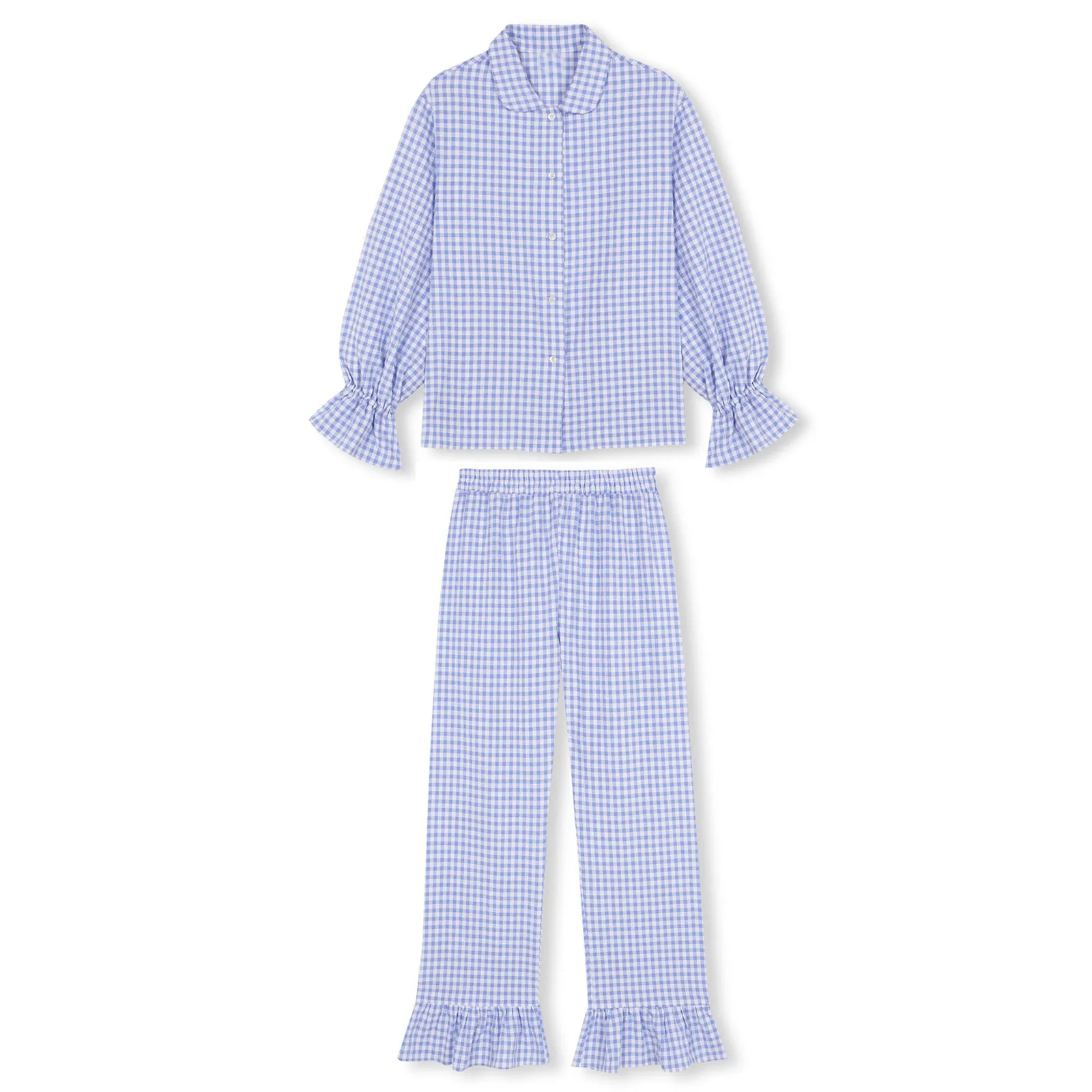 - Feature: Plaid pattern, gingham lounge outfits, Y2k plaid pajama set, puff peplum shirt ruffle pants lounge set, tie front puff sleeve babydoll top, matching with ruffle hem wide leg pants, cute ruffle trim pj set, gingham pants pjs.