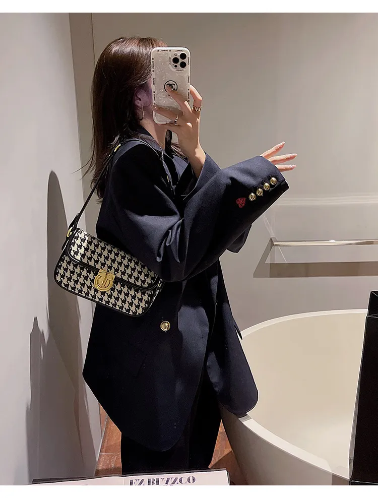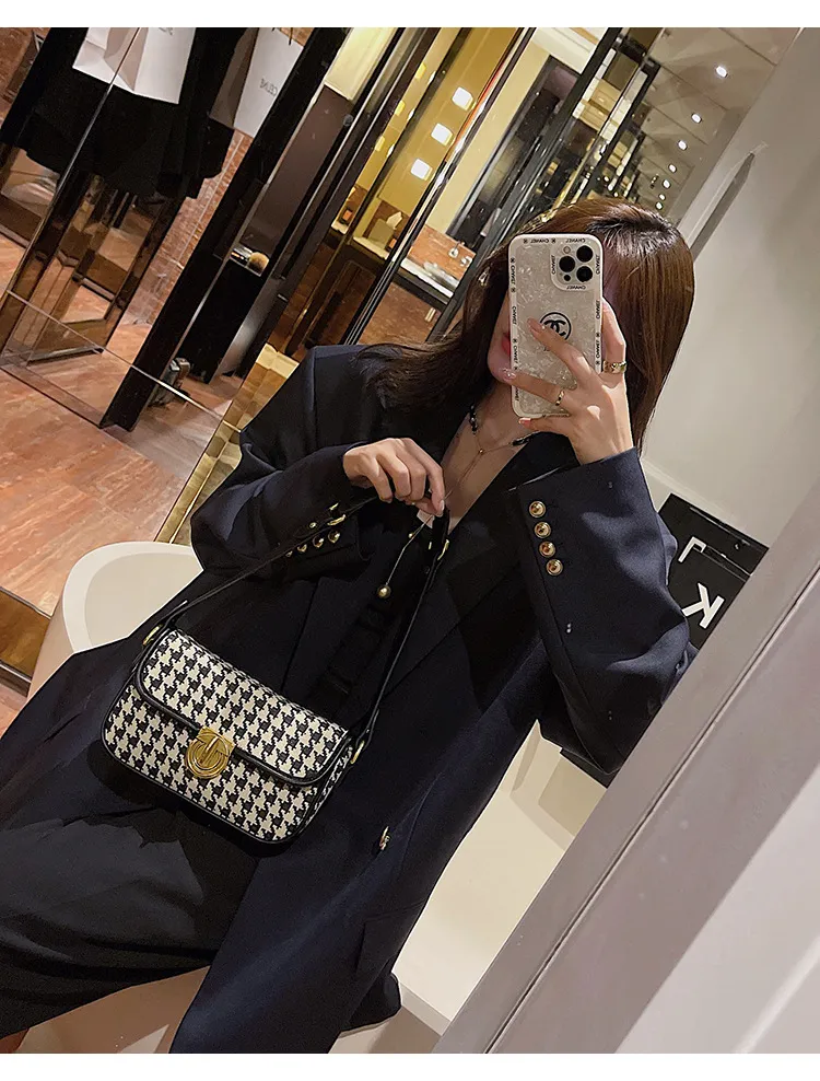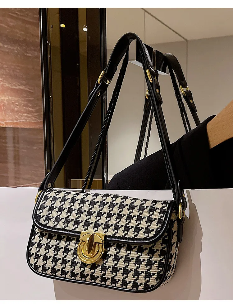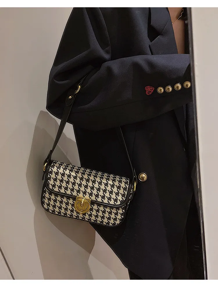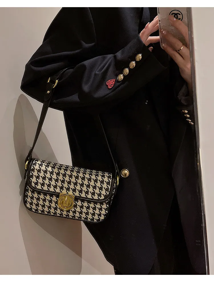 Women's Houndstooth One Shoulder Underarm Baguette Bag