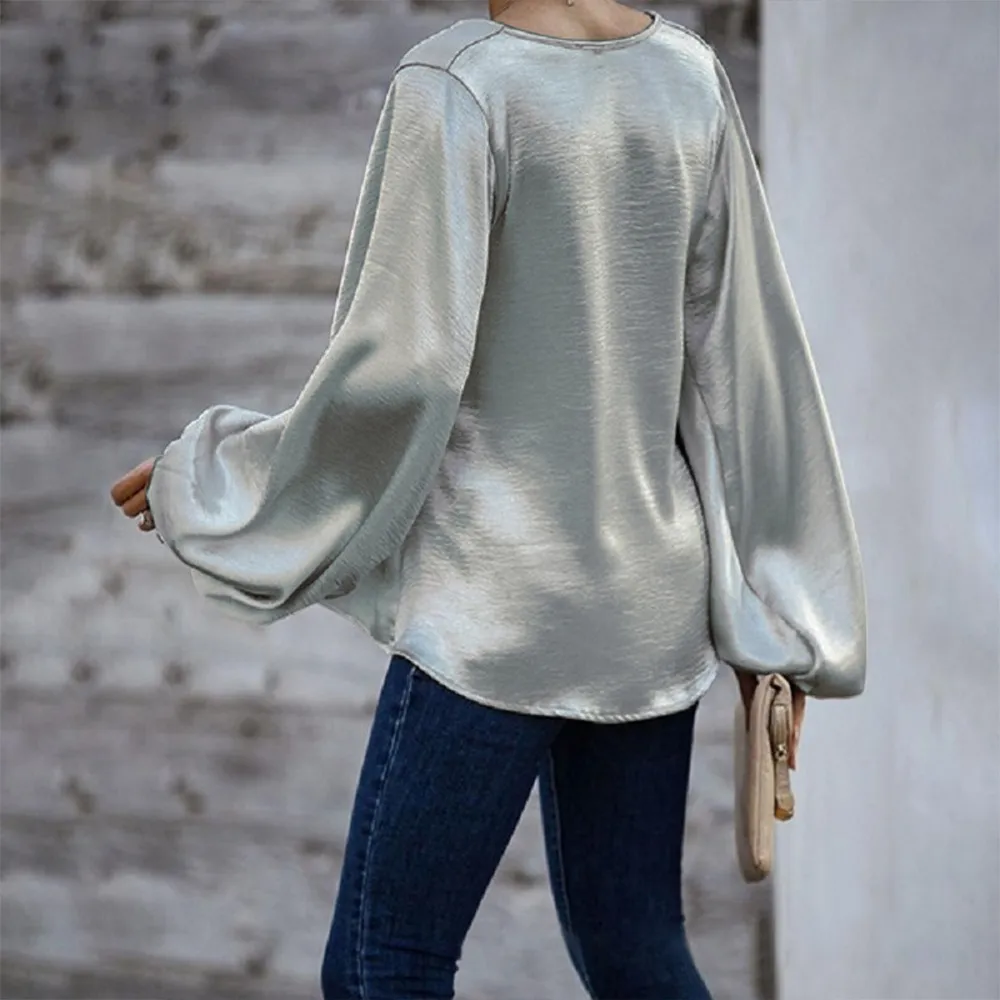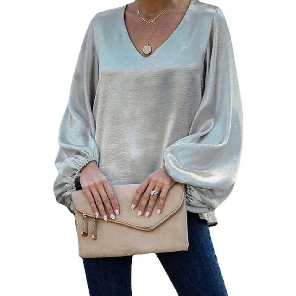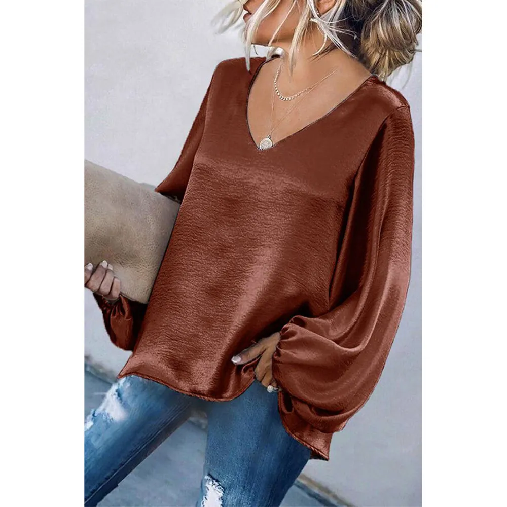 Women'S Long-Sleeved Loose V-Neck Solid Color Top T-Shirt