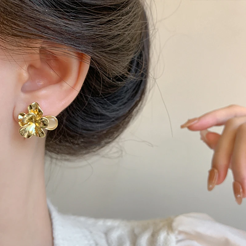 The design draws inspiration from French retro aesthetics, offering a timeless and luxurious appeal. The combination of golden petals and a three-dimensional metal structure makes these earrings a standout accessory.