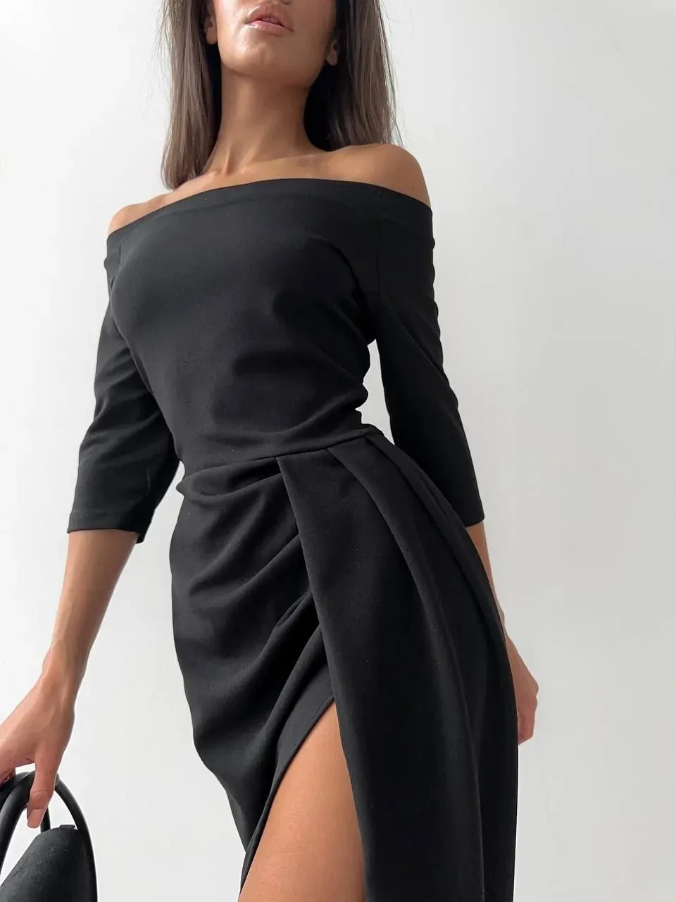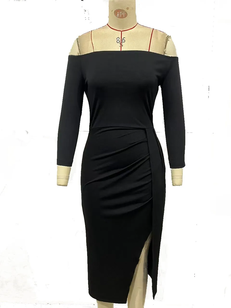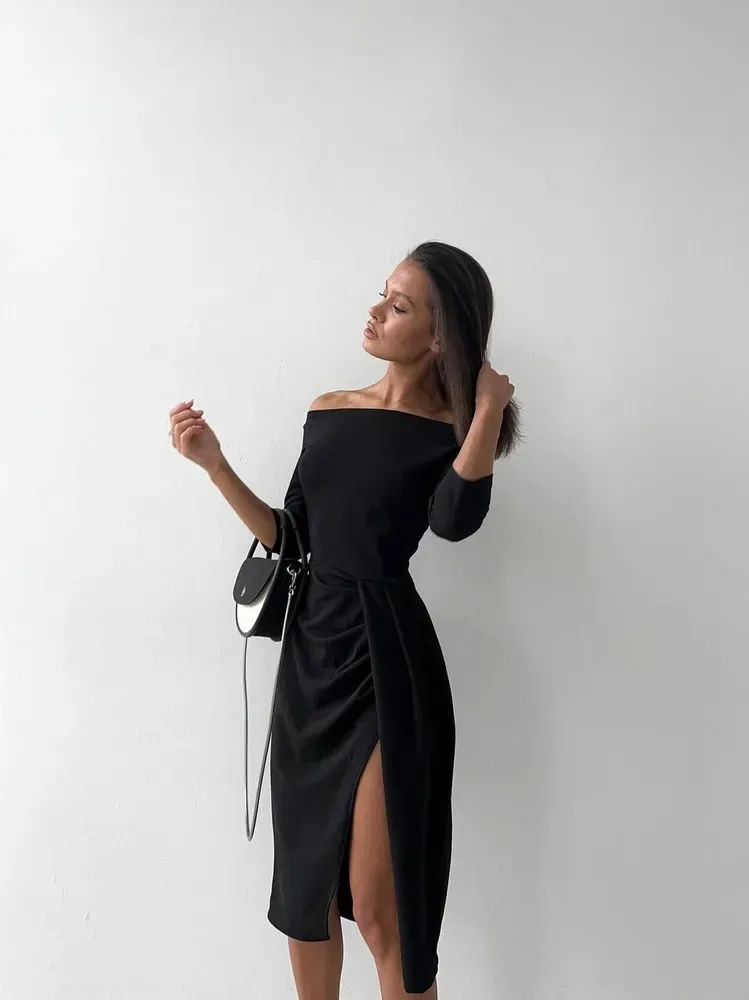 Step into timeless elegance with the Women's Off-Neck Long Sleeve Waist Slit Dress, a perfect combination of chic style and sophisticated design. This stunning dress features an off-neck neckline that beautifully frames the shoulders and collarbone, adding a touch of sensuality to the overall look. The long sleeves provide both coverage and a refined silhouette, making this dress ideal for cooler evenings or formal events. Designed to flatter, the fitted waist emphasizes your figure, while the thigh-high slit adds a subtle yet alluring touch, allowing for ease of movement and an extra hint of glamour.