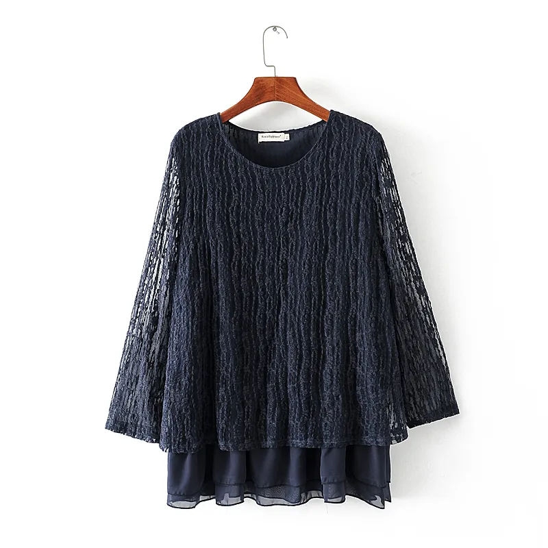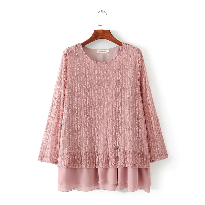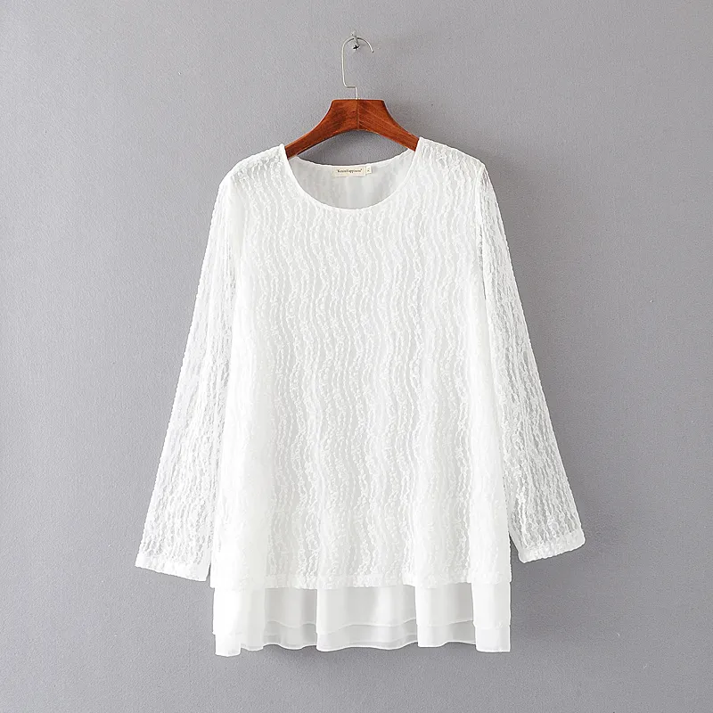Women's Plus Fertilizer Spring Loose And Thin Ladies Lace Stitching Long-Sleeved Chiffon Shirt