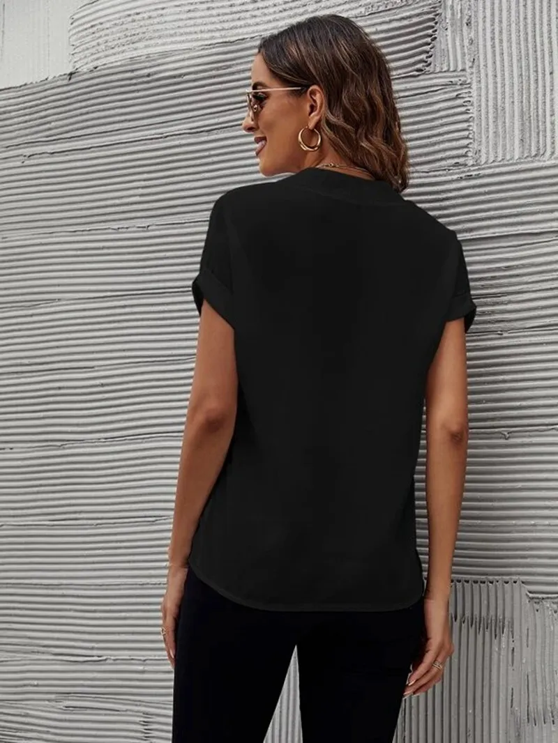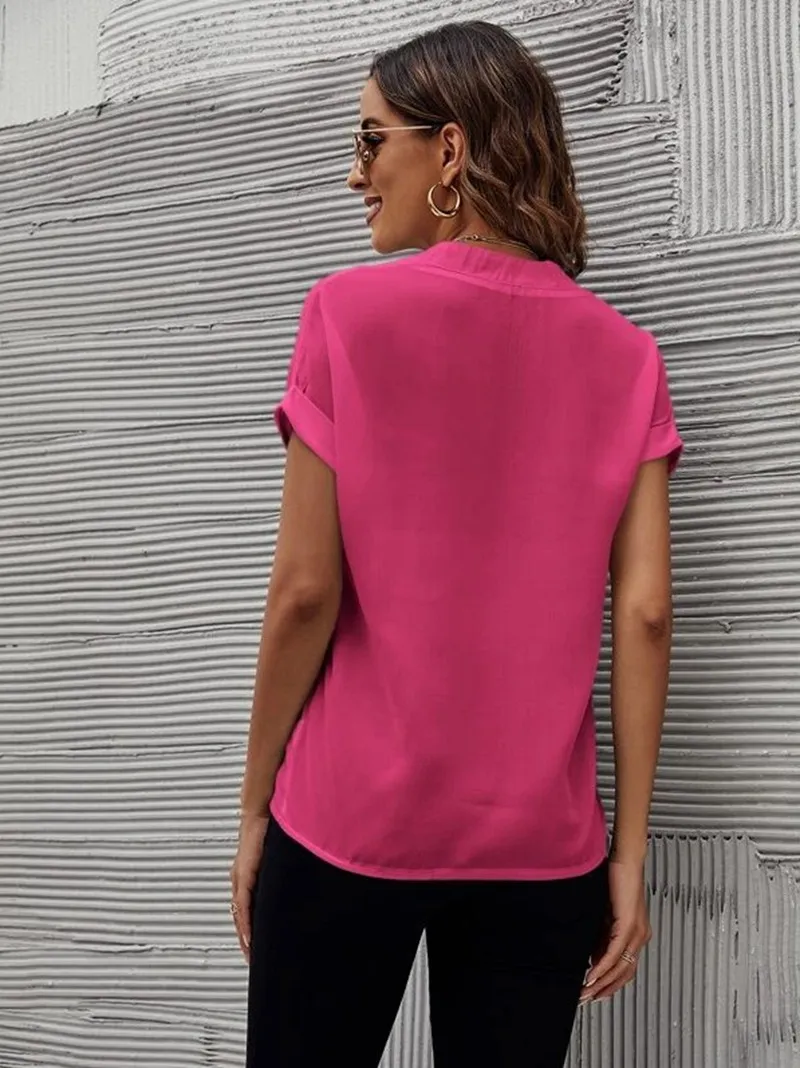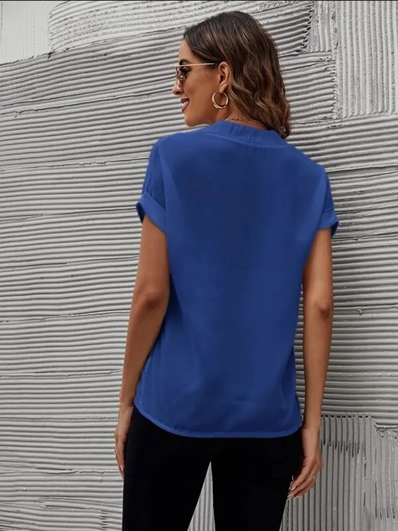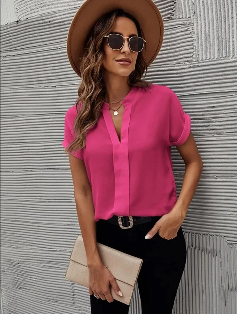 Summer calls for comfortable, stylish, and versatile clothing, and the Women's Short-sleeved V-neck Shirt checks all the boxes. This casual solid color shirt is designed to be the perfect go-to top for every occasion, whether you're heading to the office, meeting friends for brunch, or just enjoying a day out in the sun.