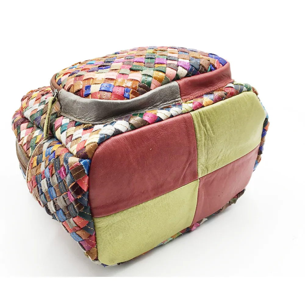 The hand-woven leather and bold stitching colors make this backpack a standout accessory that complements both casual and formal looks.