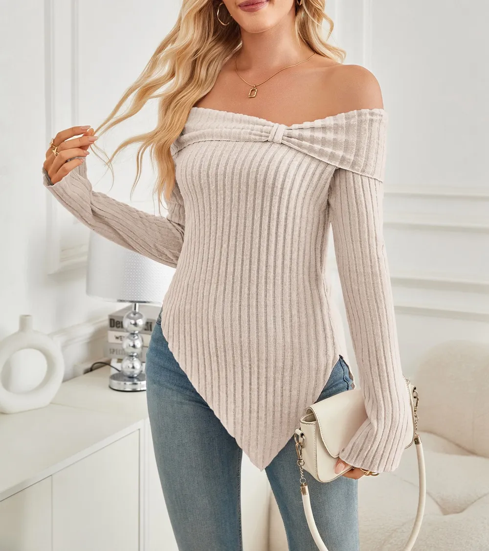 Women’s Trendy Knit Ribbed Top – Bow Tie One-Shoulder Long Sleeve Slim Sweater with Split Hem