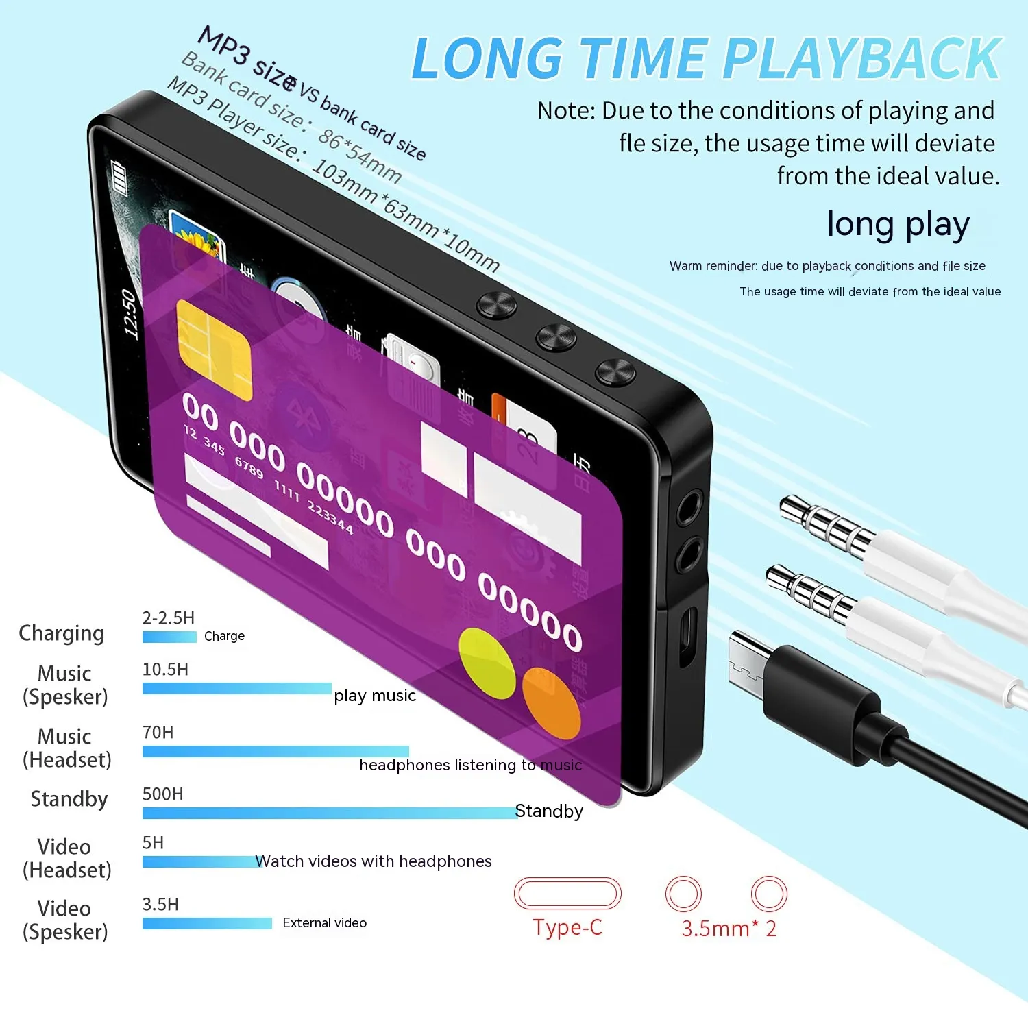 - Extended Playback Time: Up to 40 hours of audio or 6-8 hours of video playback on a single charge.