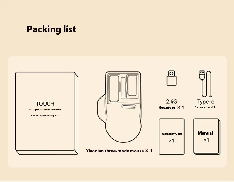 Receiver x1 Warranty Card x1 Type-C data cable x1 Instruction manual x1 Small tilt the third mock examination mouse x1
