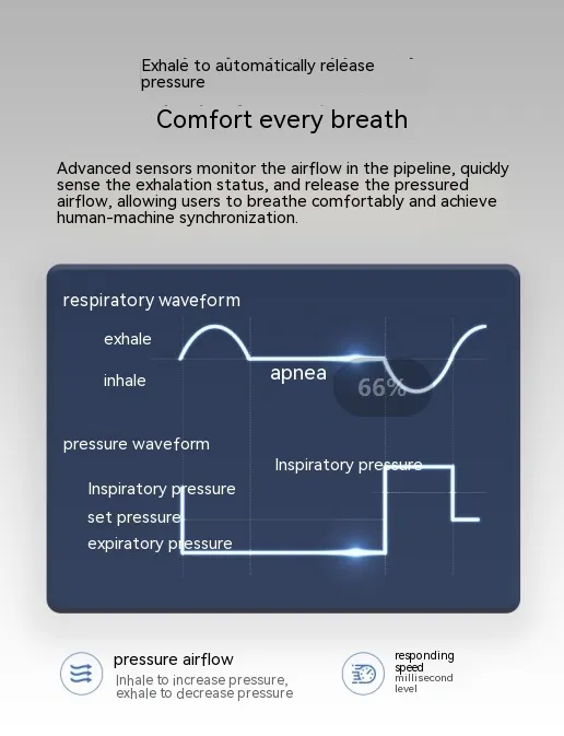 The ventilator employs exhalation therapy, promoting optimal airflow during sleep. This technology helps in reducing airway resistance, thereby minimizing snoring and enhancing overall sleep quality.