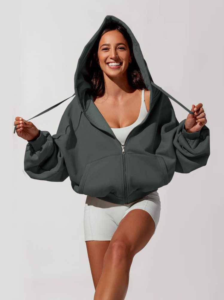 Our Zipper Hoodies Sports Jacket is perfect for women seeking a blend of fashion and function. Designed with a full-zip front, this loose hooded sweatshirt offers a casual yet stylish look. The solid color design ensures versatility, making it easy to pair with various outfits for different occasions.