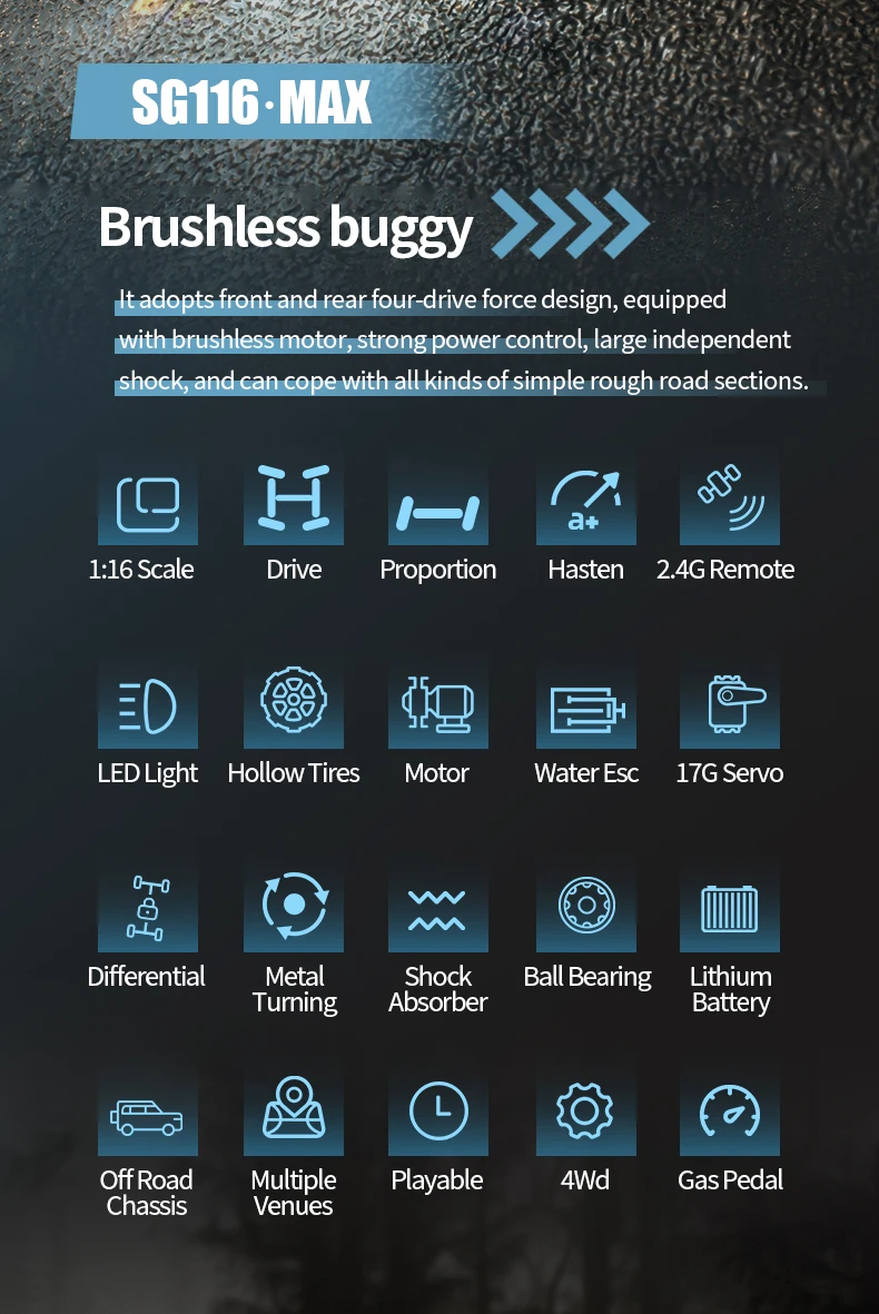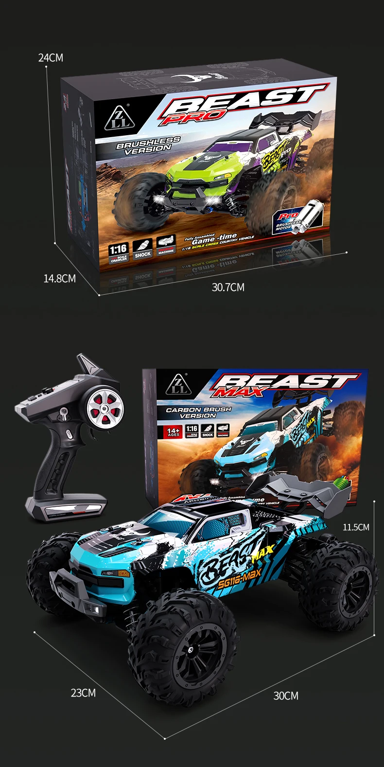The ZLL SG116 MAX RC car features a brushless motor and 4WD, achieving speeds up to 80KM/H. This professional racing car is designed for high-speed off-road drifting and operates on a 2.4G frequency for precise control. Perfect for enthusiasts seeking powerful performance and thrilling racing action.