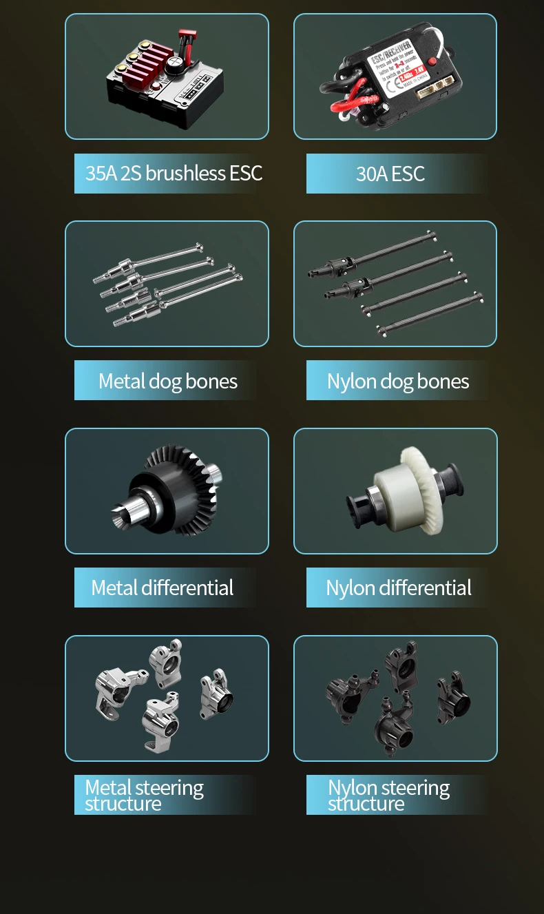 17G FIVE-WIRE SERVO | 30A ESC | 390 carbon BRUSH STRONG MAGNETO MOTOR | BALL BEARING | SHOCK ABSORBER | NYLON DOG BONES TRANSMISSON SHAFT | NYLON STEERING STRUCTURE | NYLON DIFFERENTIAL
