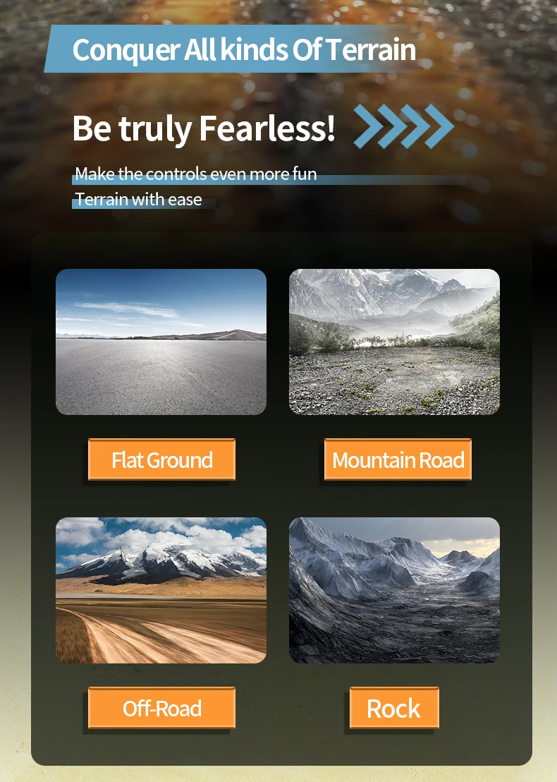 It adopts front and rear four drive force design, equipped with brushless motor, strong power control, large independent shock, and can cope